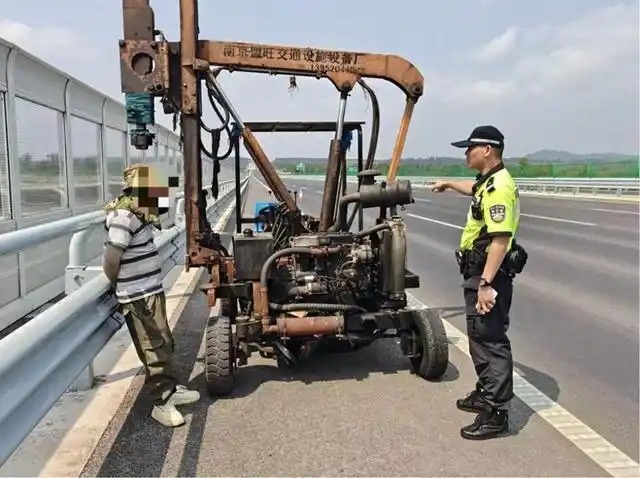 巡逻期间,民警发现一辆严禁驶入高速公路的液压打桩机工程车,正违规在高速公路上疾驰。“该类车辆构造复杂、视线盲区极大,一旦操作失误,极有可能引发连环追尾,后果不堪设想。”执勤民警当即示意车辆靠边接受检查。